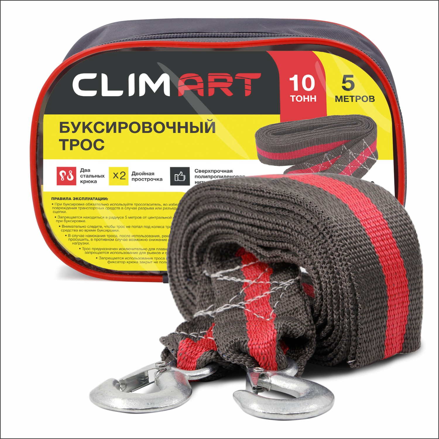 Буксировочный трос CLIMART имеет длину 5 метров. Это позволяет не терять управляемость при буксировке автомобиля и соблюдать безопасную дистанцию. Надежную сцепку обеспечивают стальные крюки.
