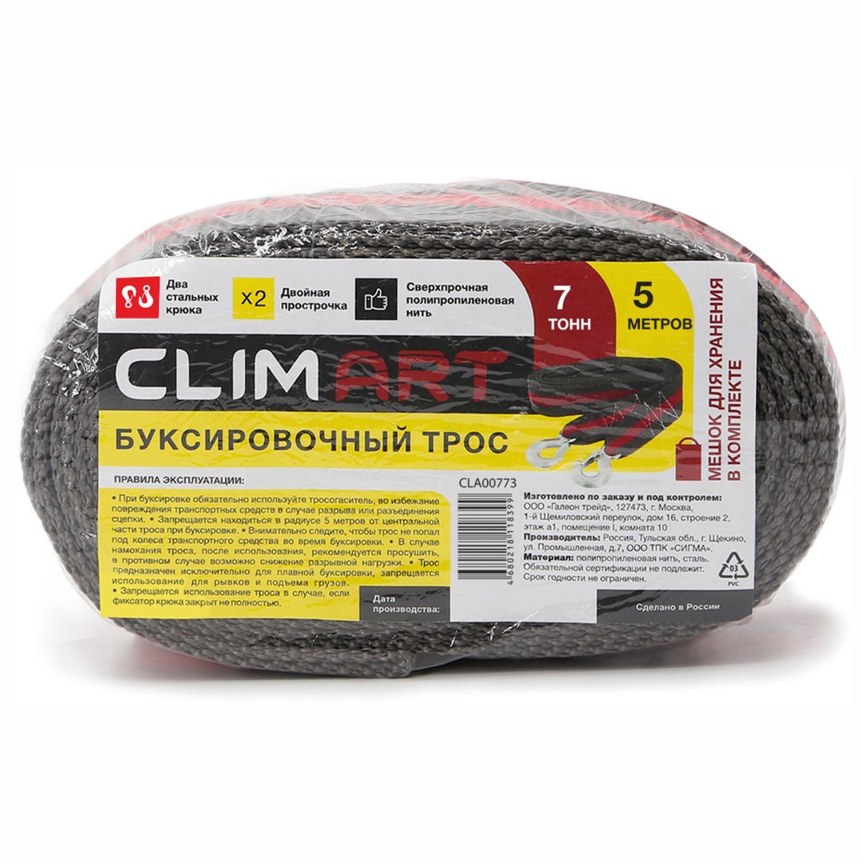В комплектацию входит: буксировочный трос для автомобиля CLIMART, два крюка и сумка-мешок, в которой трос удобно перевозить и хранить в багажнике.