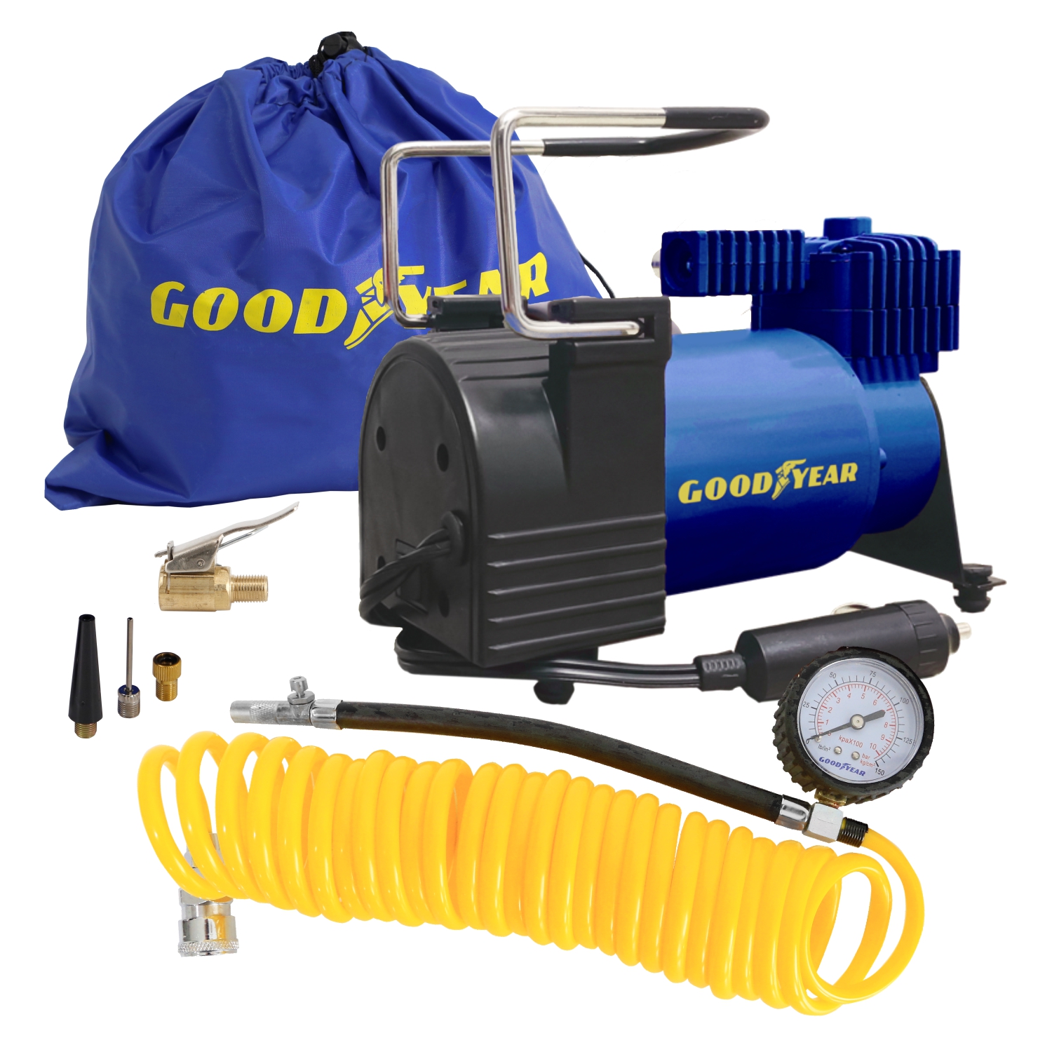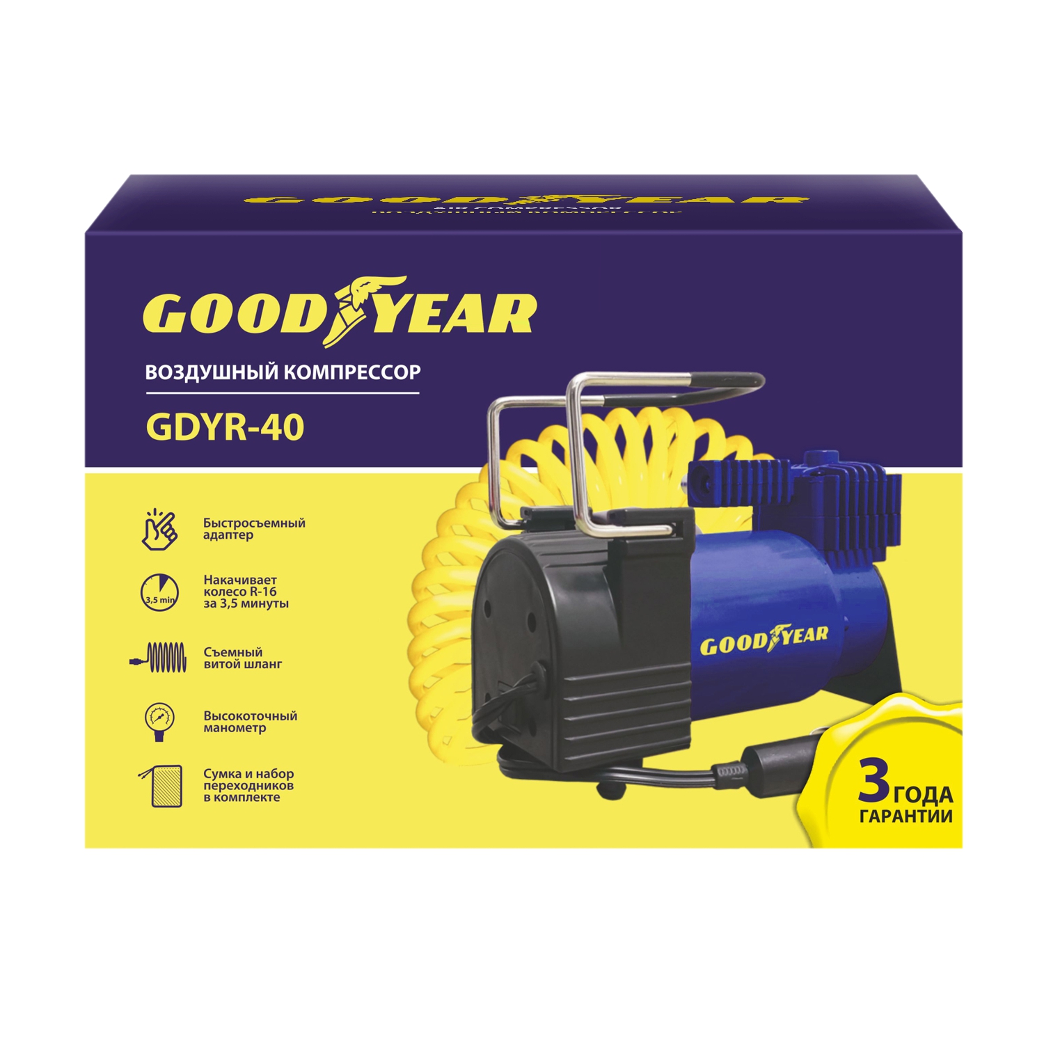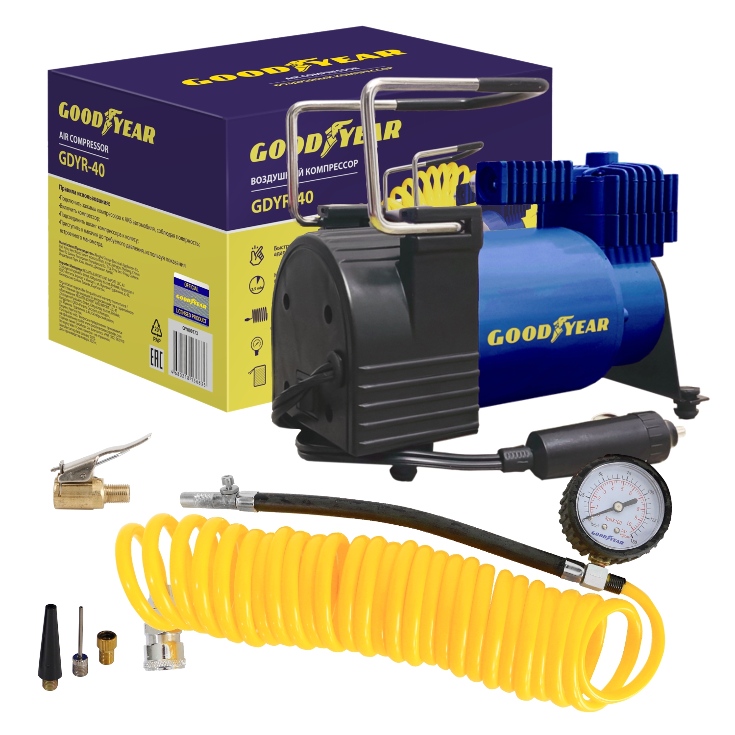 Воздушный автомобильный компрессор Goodyear GDYR-40 — оригинальный лицензионный продукт высокого качества, незаменимый помощник в дороге для любого автолюбителя. Компактное устройство предназначено для накачивания автомобильных и велосипедных шин, резиновых лодок, мячей, матрасов.
