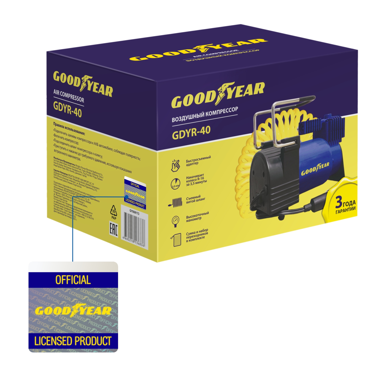 Каждая упаковка защищена от подделок голограммой с уникальным номером. Только компрессоры с этим знаком, являются оригинальным лицензионным продуктом Goodyear с гарантированно высоким качеством.