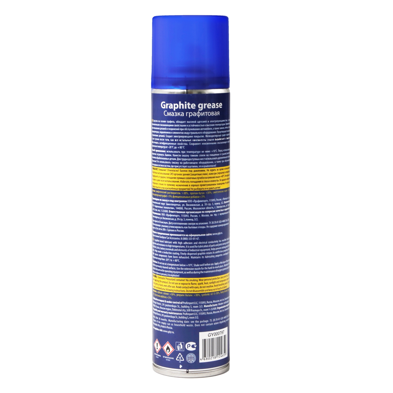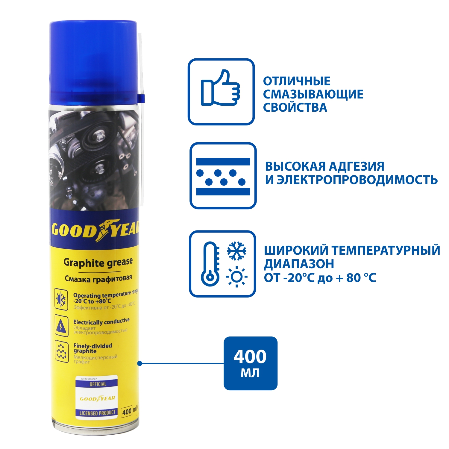 Графитовая смазка Goodyear применяется для смазывания деталей и соединений при обслуживании автомобиля, а также замков, петель, клемм аккумуляторов, подшипников и элементов индустриального оборудования.