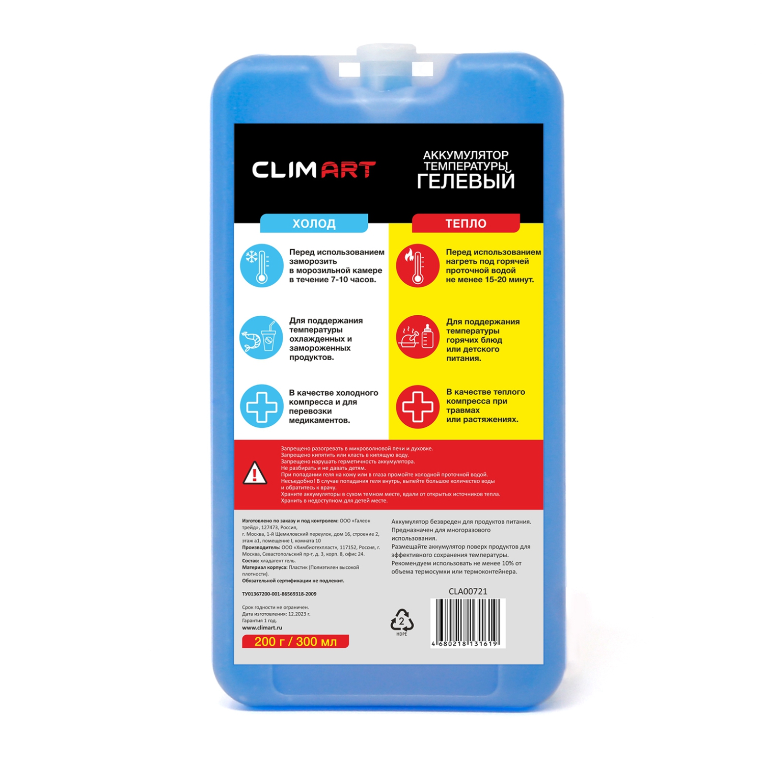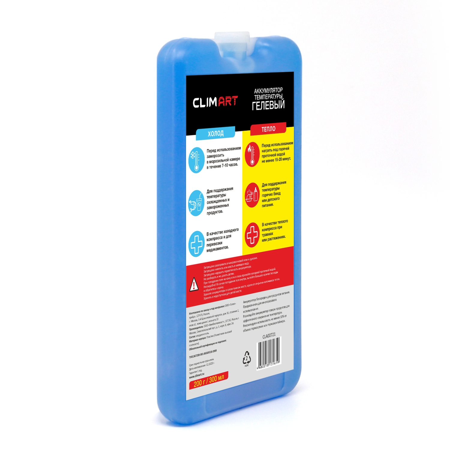 Помимо этого, гелевый аккумулятор CLIMART позволит вам поддерживать температуру горячих блюд или детского питания. Его можно использовать в качестве теплого компресса при травмах и растяжениях. Перед использованием аккумулятора для поддержания теспла необходимо нагреть его под горячей проточной водой не менее 15-20 минут.