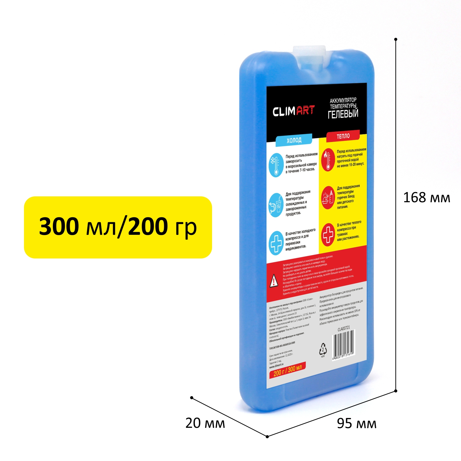 Гелевый аккумулятор температуры CLIMART 200 г идеально подойдет для небольших сумок-холодильников объемом